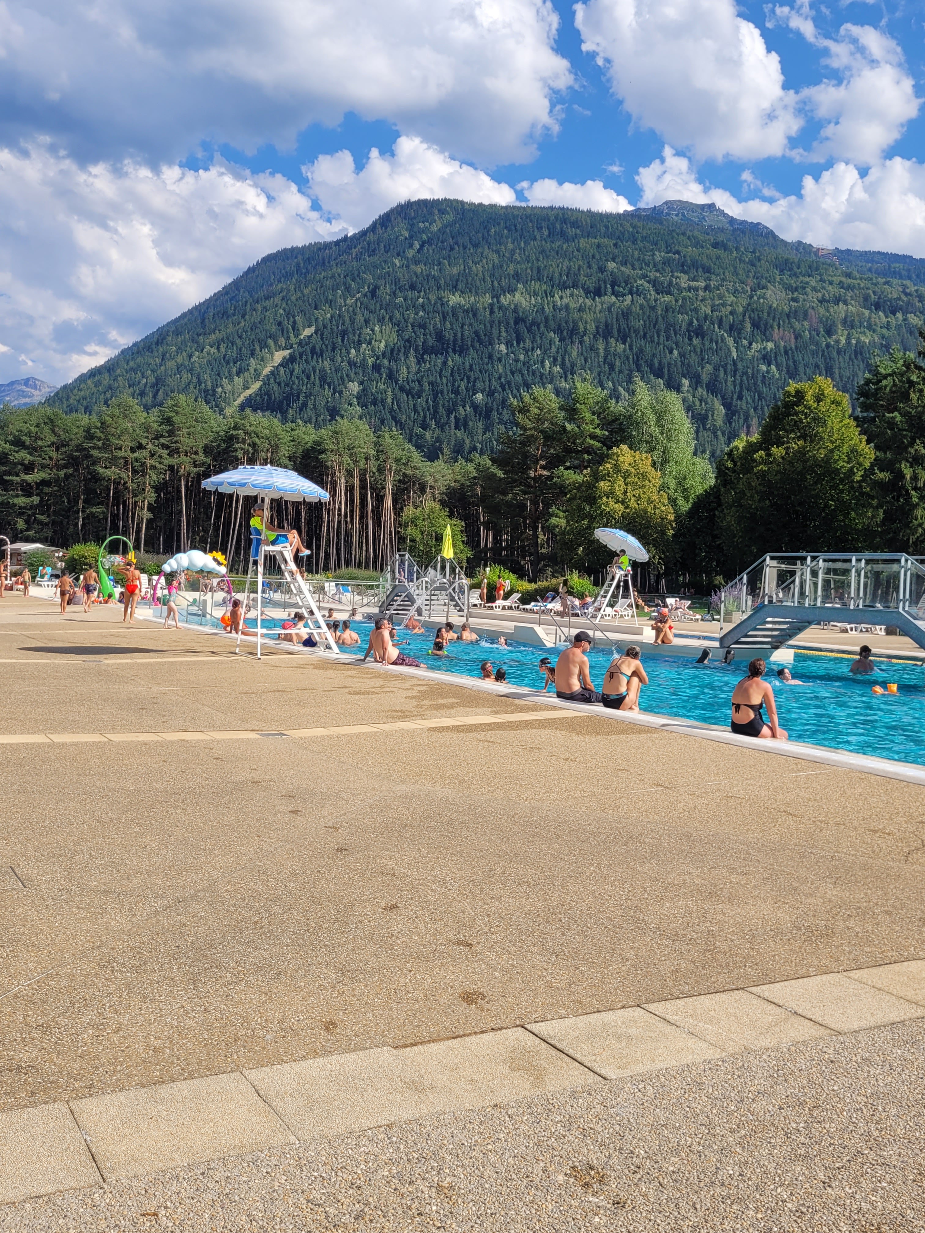 3 bassins dont un grand découvert avec plongeoirs. Vue sur les montagnes. Transats pour se détendre au soleil. Pataugeoire extérieure pour les petits. Lieu très propre. L'eau est un peu froide.
