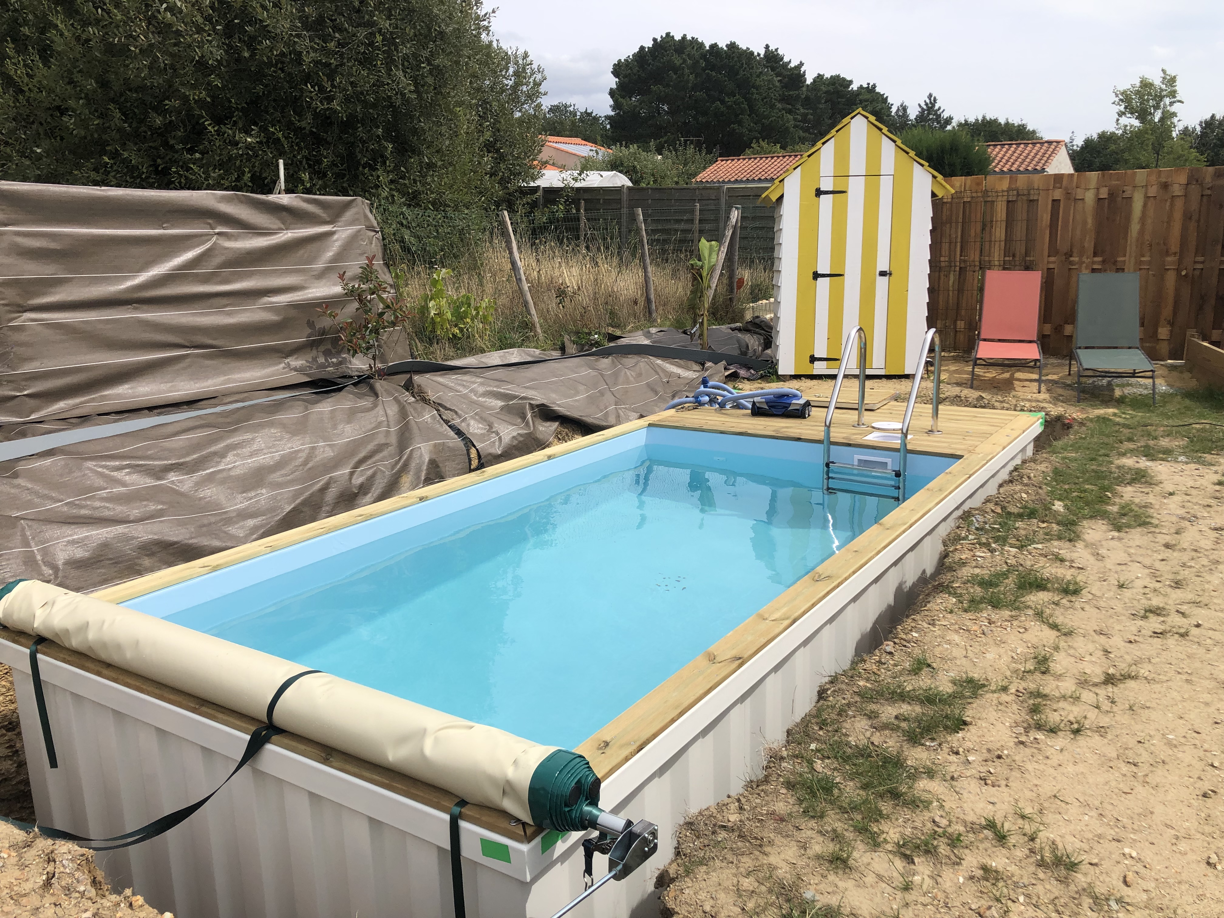 Posté le 01/08/2023 à 13:08"Piscine hors sol, Ne vous inquiétez pas tout est maitrisé la commande, la fabrication, la livraison, le SAV. La livraison est prévue le 29 juin, l'énorme camion doit entrer dans le jardin par le portail, l'habileté du conducteur permet de glisser le camion entre les deux poteaux au cm près. Le grutage est impressionnent et on pose la piscine à l'endroit prévu pile-poil. Le raccordement électrique, la mise en eau et en service se fait par nos soins, documentations sur les genoux et contact ponctuel du SAV. Au bout de quelques jours fuite au droit du raccordement de l'axe du volet des vis desserrées. Vidange partielle du bassin, reprise de l'étanchéité des vis, on est reparti pour les baignades. Puis quelques jours plus tard fuite sur un des flexibles de la pompe à chaleur, changement du flexible et hop on peut réchauffer l'eau ( ce n'est pas la canicule cette année en Charente Maritime) Malgré ces imprévus et nos baignades repoussées ponctuellement nous sommes ravis. Vous conseiller Pool Container, un grand oui ! toujours présent, jamais abandonné, rappelé rapidement. C'est le service compris."